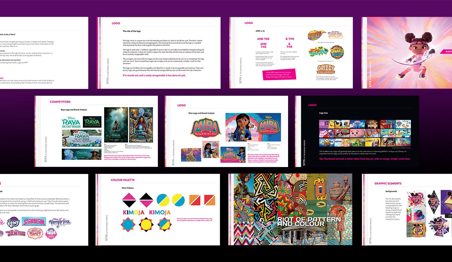 The logo has a playful bounce that matches the titular characters' love of dance and martial arts. The pink colour was chosen is punchy and stands out on the black which is complimented by a sophisticated brand colour palette.